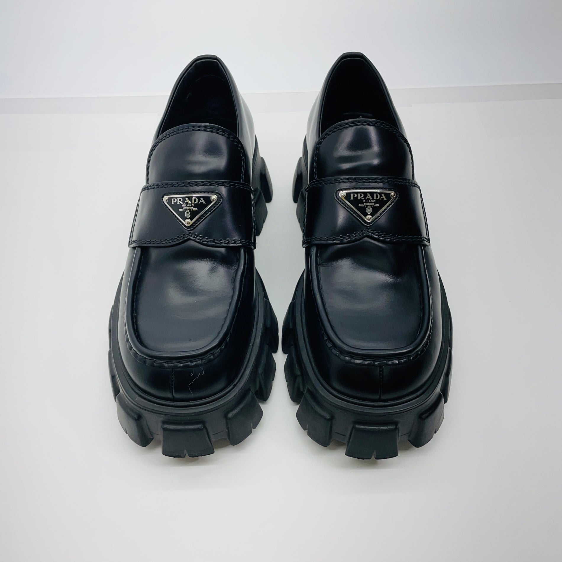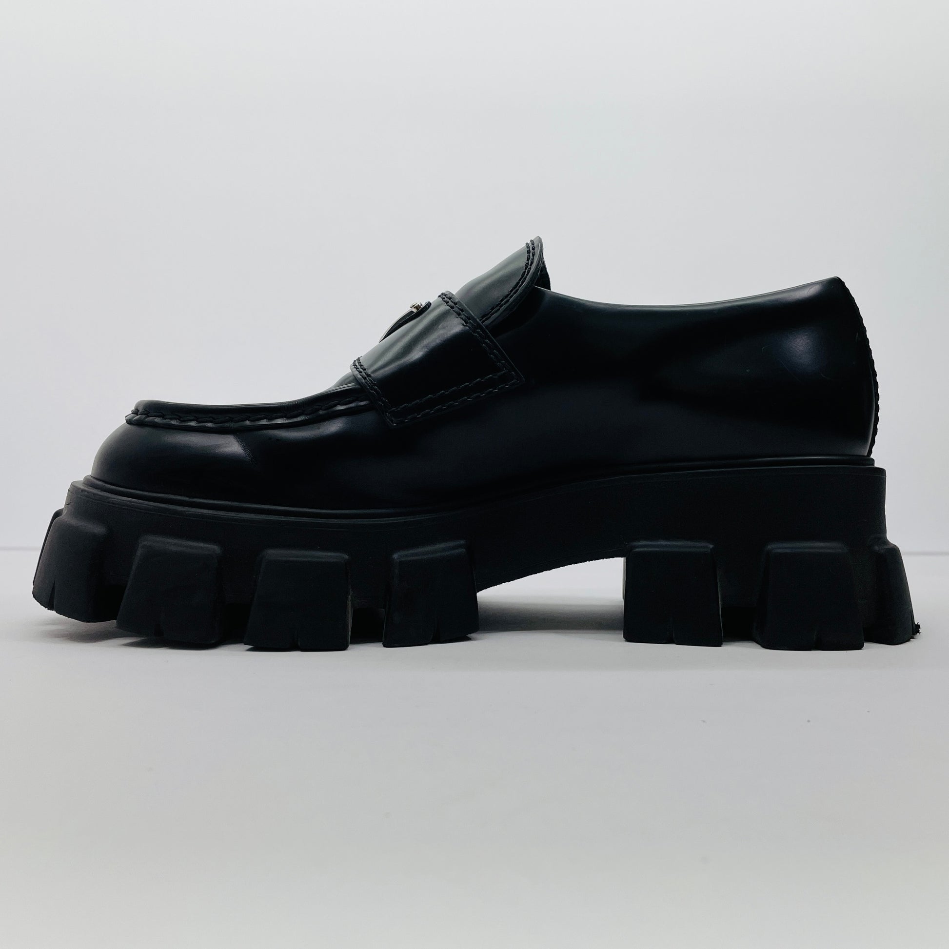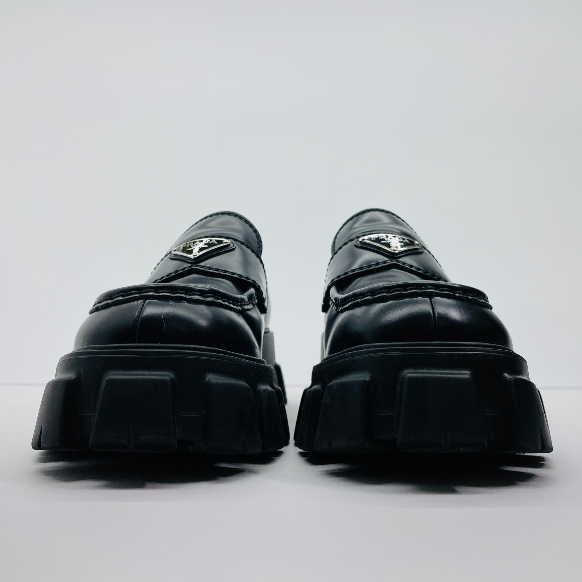 美品 PRADA プラダ ローファー モノリス ブラッシュドレザー サイズ:7.5(26.5cm相当)【C4597-100】